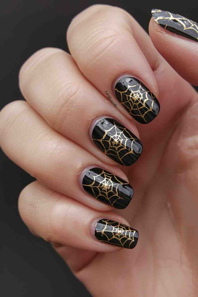 Delicate gold spiderweb designs on a black base create a chic, spooky aesthetic. Perfect for Halloween events without going too playful.