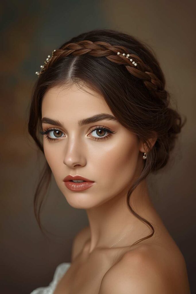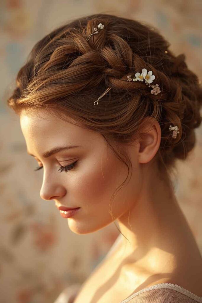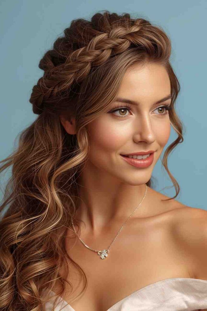 Create two braids, cross them over your head like a crown, pin securely, and gently loosen sections for softness.