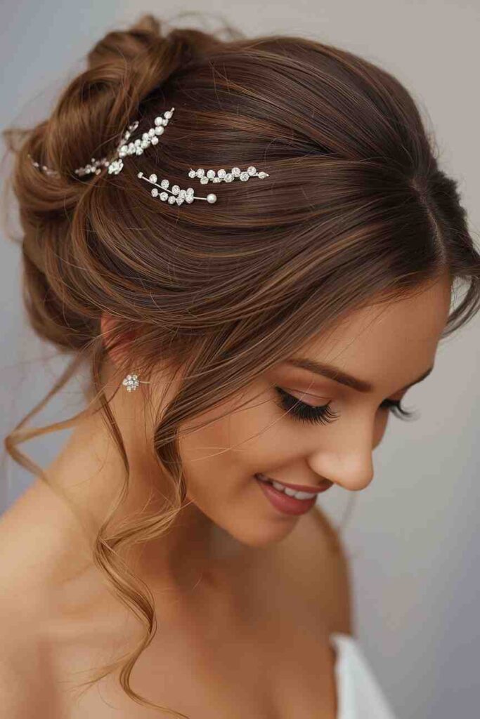 This elegant updo combines soft curls with sparkling pins, giving your hairstyle a festive December glow. Ideal for Christmas parties, winter weddings, and New Year’s events, the decorative accents enhance the curls and make the hairstyle feel celebratory. It’s a beautiful option for anyone who loves adding a little extra shine.