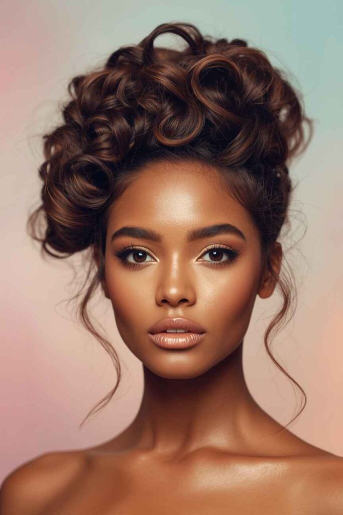 This curled updo adds a touch of luxury and romance perfect for winter events. The curls create soft volume that enhances your facial features and adds warmth to your overall look.
