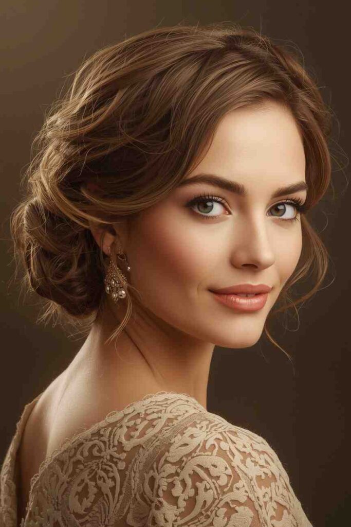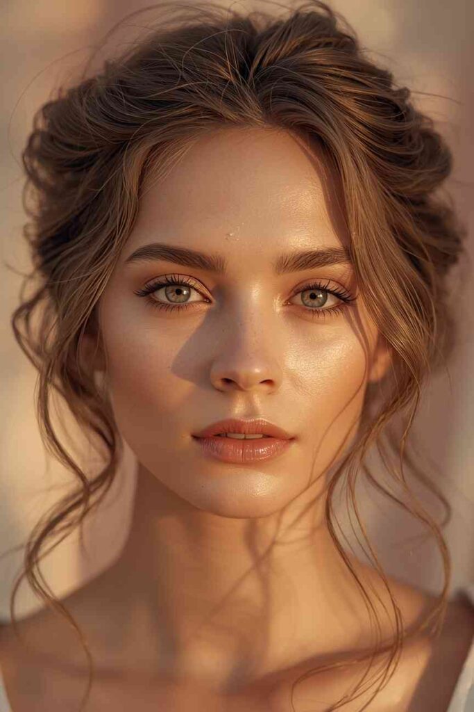 The messy romantic updo is a December favorite for those who love softness, texture, and a touch of whimsy. This style combines gentle volume with loose pieces that frame the face, creating a naturally beautiful winter look. It’s perfect for cozy gatherings, winter engagement photos, or relaxed holiday celebrations.