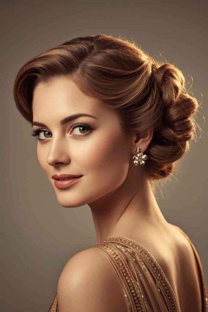 This updo also works wonderfully with winter fashion—especially cozy sweaters, fluffy collars, and embellished dresses. Its soft structure frames the face beautifully and keeps hair secure throughout long evenings, making it both practical and stylish for the holiday season.