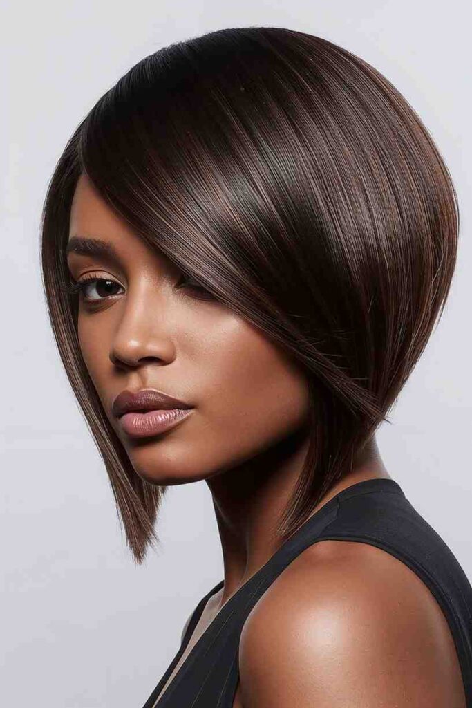 This asymmetrical cut adds drama and modernity. The angled bob slopes longer in the front, giving the style movement and edge.