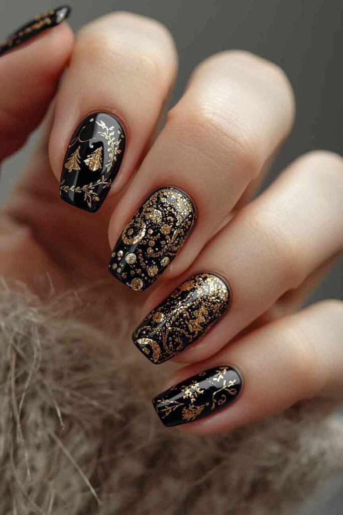 14. Black & Gold Glitter Christmas Nails