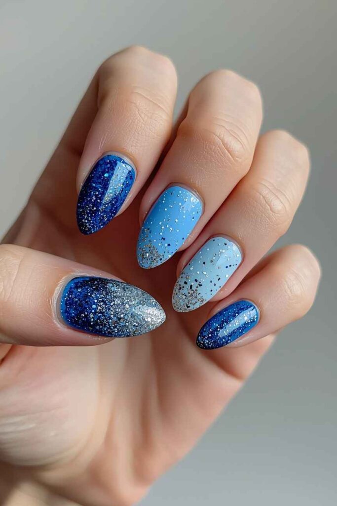 Blue glitter nails evoke the charm of snowy nights and frosty mornings. From icy pastels to deep navy tones, blue glitter brings a soothing, magical winter aesthetic. Paired with silver accents or snowflake designs, this look turns your nails into a winter wonderland scene.
