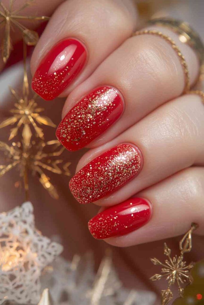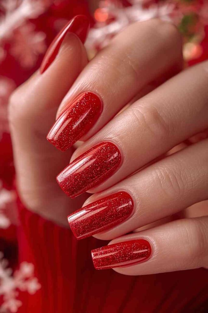 Whether you go for a fully glittered nail, a glossy red with glitter accents, or an ombré effect, this style looks bold, romantic, and holiday-perfect. It works beautifully for parties, casual outings, and festive dinners, making it a versatile Christmas favorite that never disappoints.