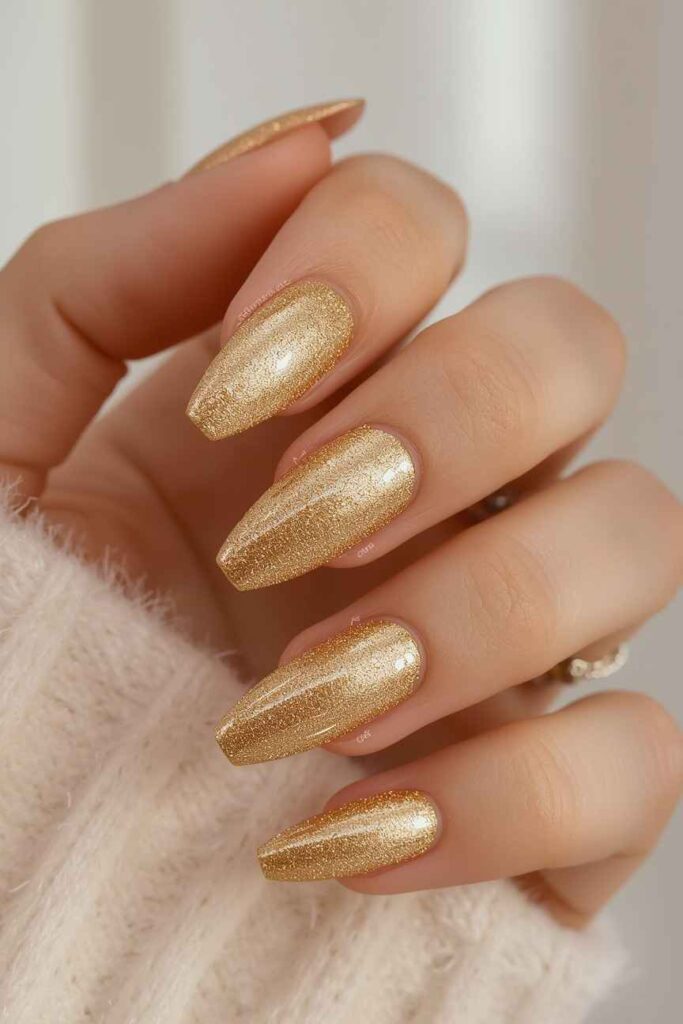 Gold glitter nails are also incredibly versatile—they suit formal events, holiday parties, and elegant dinners alike. Their warm glow enhances every outfit and highlights your hands in the most flattering way, especially under soft holiday lighting.