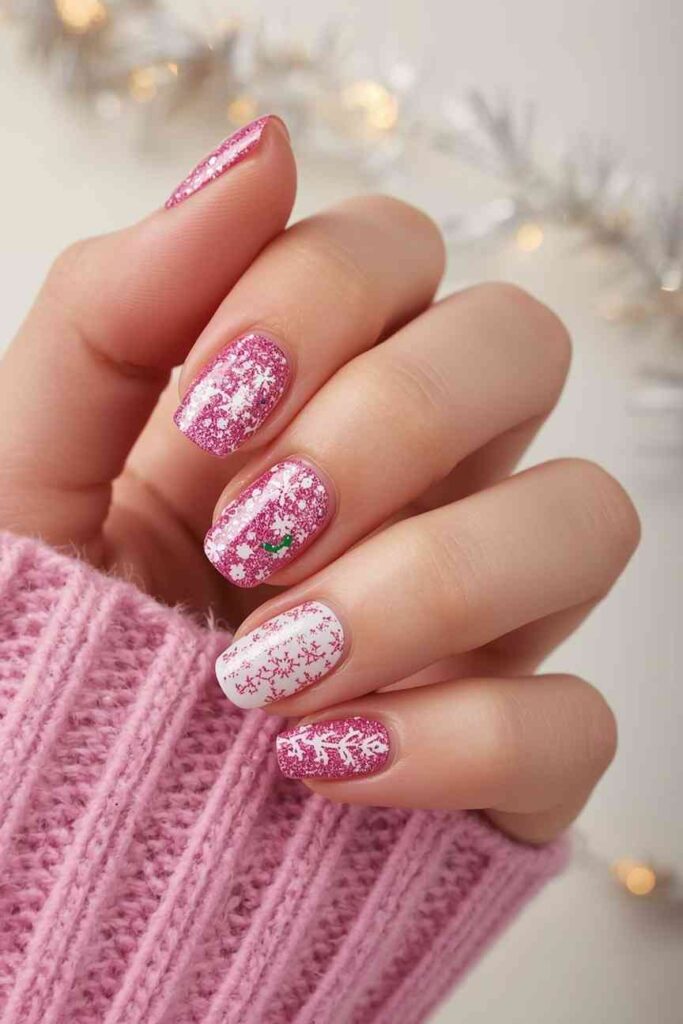 18. Pink Glitter Christmas Nails