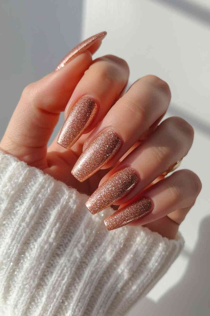 Rose gold glitter nails are ideal for those who love soft, romantic winter glam. The warm pink tones paired with metallic shimmer create a feminine and delicate look that still feels festive. This shade looks gorgeous on all skin tones and suits both short and long nails.