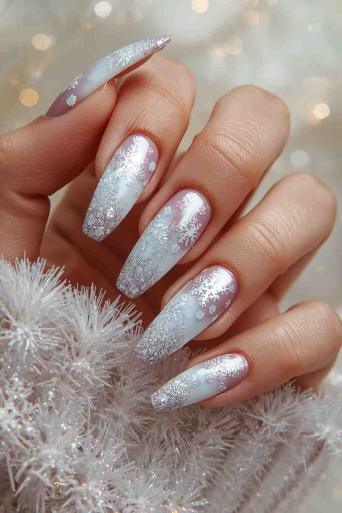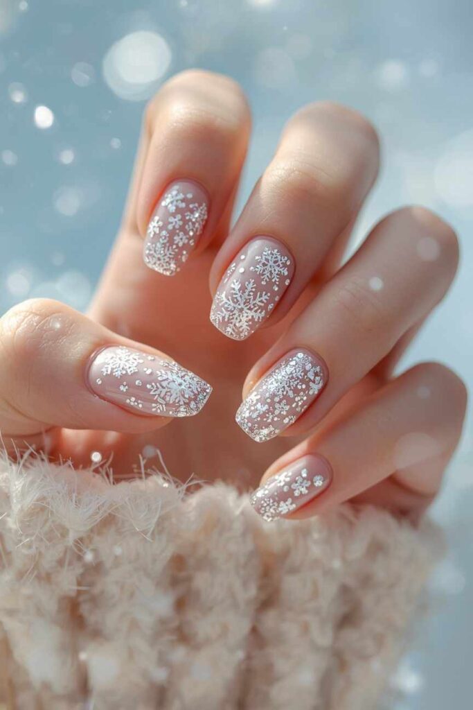 12. White Glitter Snowflake Nails