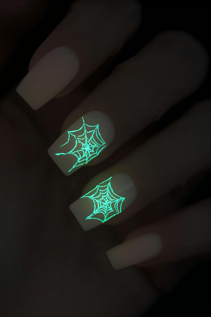 Delicate spiderwebs outlined in glow-in-the-dark polish create a spooky and elegant vibe.