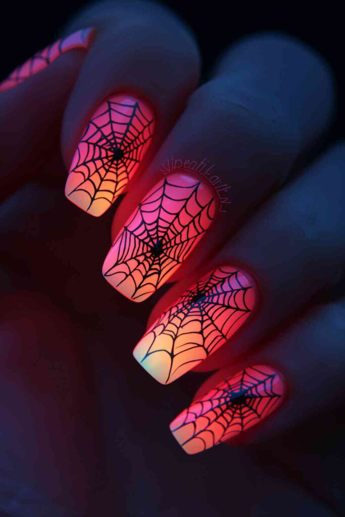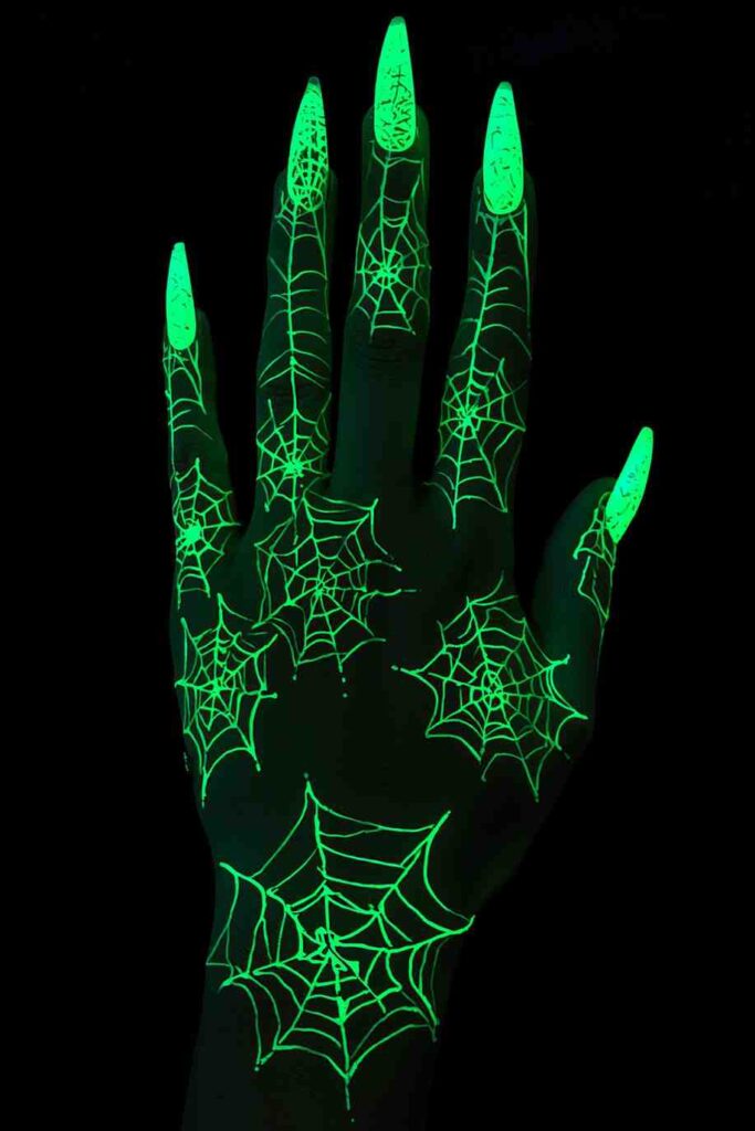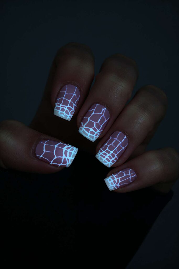 Draw glow-in-the-dark webs at the base of the nail (half-moon area) for a chic, inverted design.