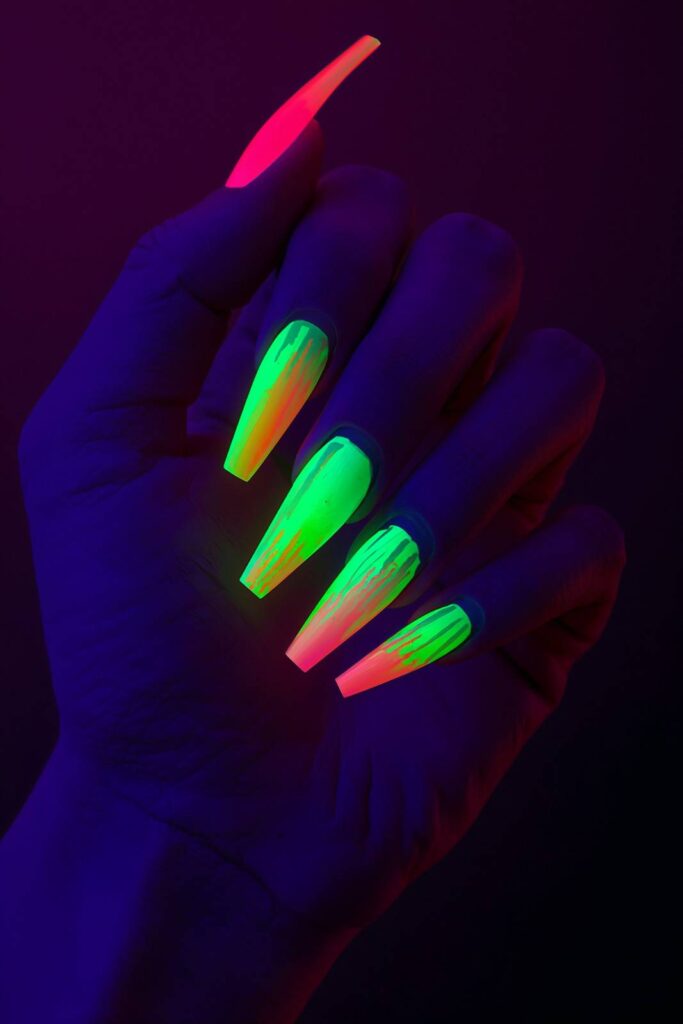 Neon red or green glow polish used to create “dripping” effects gives a thrilling, horror-movie look.