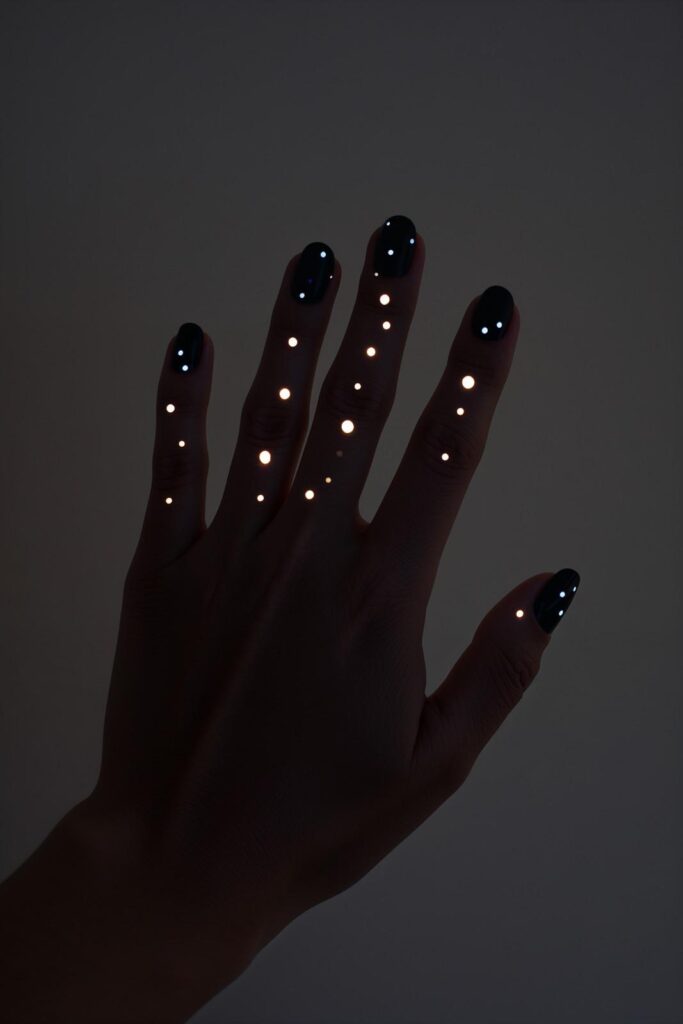 Simple glowing dots scattered over black polish create a starry, playful effect.