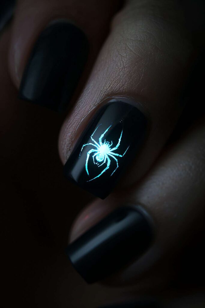 A single glowing spider on one accent nail paired with dark solids creates a minimal yet impactful look.