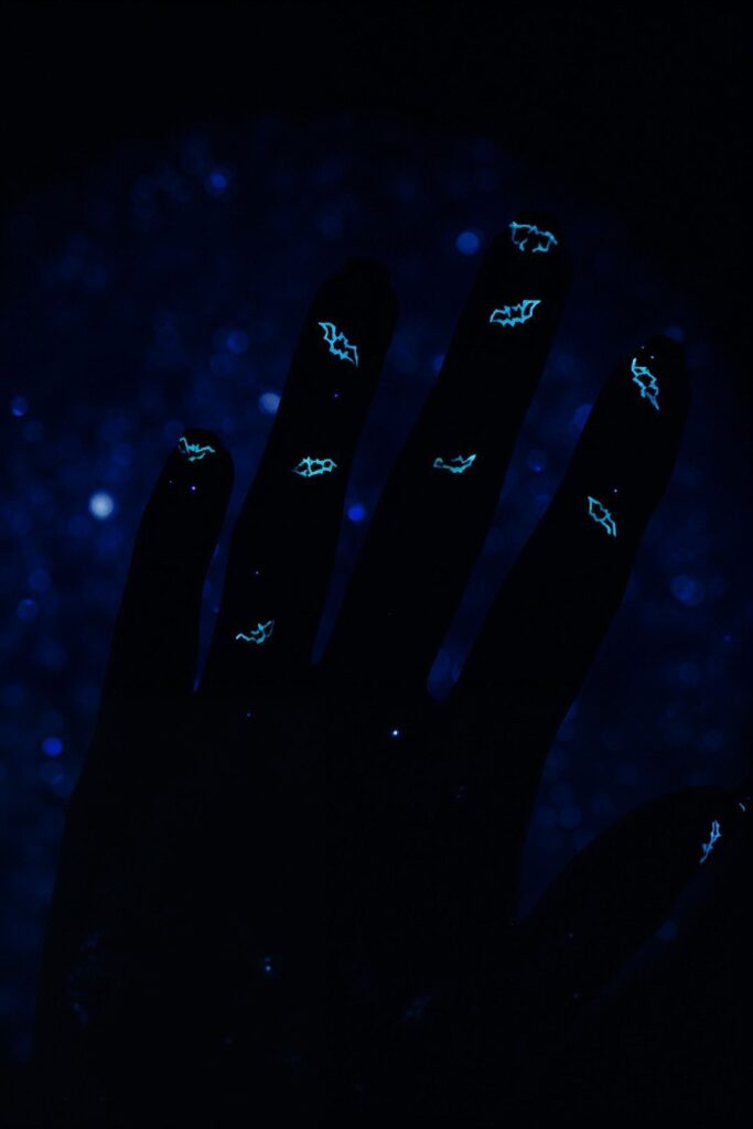 Tiny bat silhouettes outlined in glow polish against deep blue or black backgrounds look enchanting after dark.