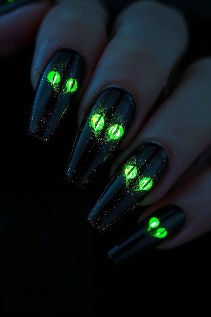 Green glowing cat eyes on dark nails add a mysterious, witchy charm.