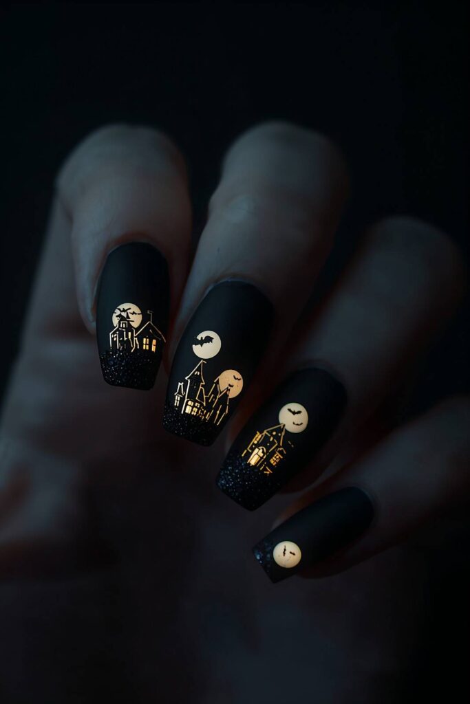 Tiny haunted houses, bats, and moons glow on black nails for a mini Halloween landscape.