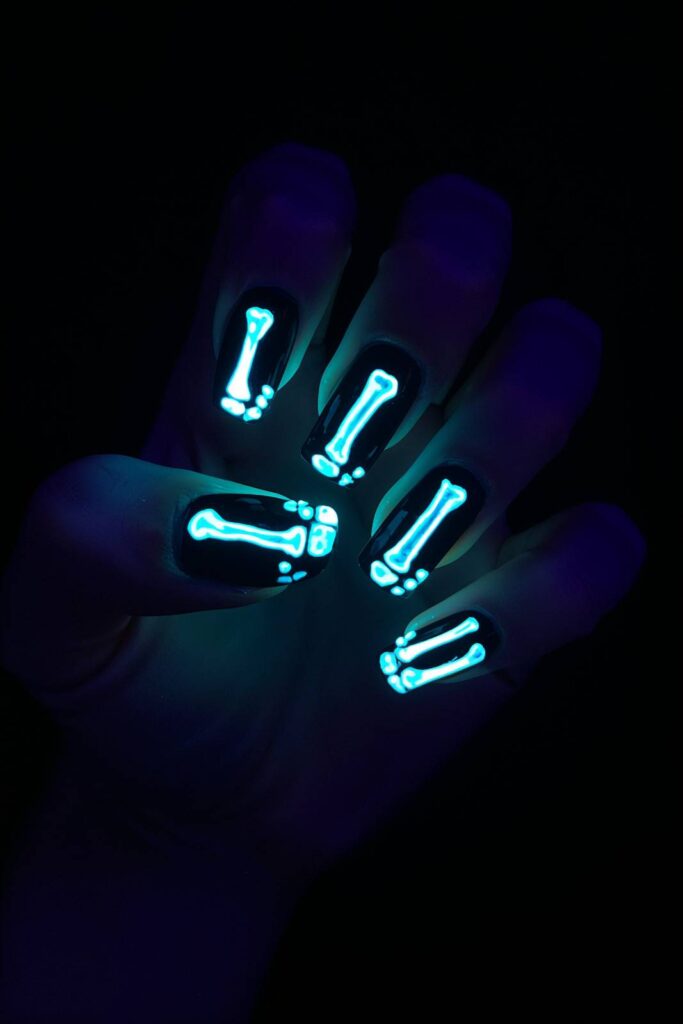 Neon skeleton bone outlines on black nails give a cool x-ray effect in the dark.