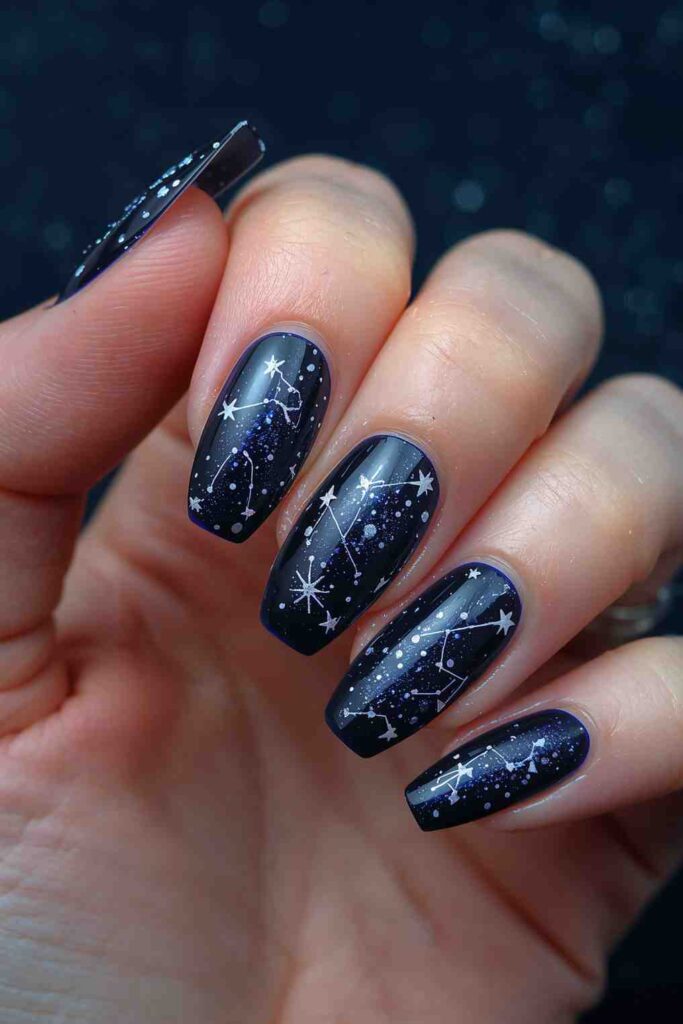 Tiny glowing stars and constellations against a midnight blue background create a magical, witchy vibe.