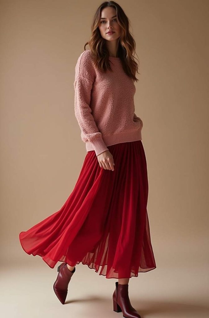 It allows you to feel cozy without appearing bulky or overdone. The contrast between structured knitwear and fluid fabric creates a charming, effortless look that feels comfortable, romantic, and ideal for enjoying Valentine’s Day without any fuss.