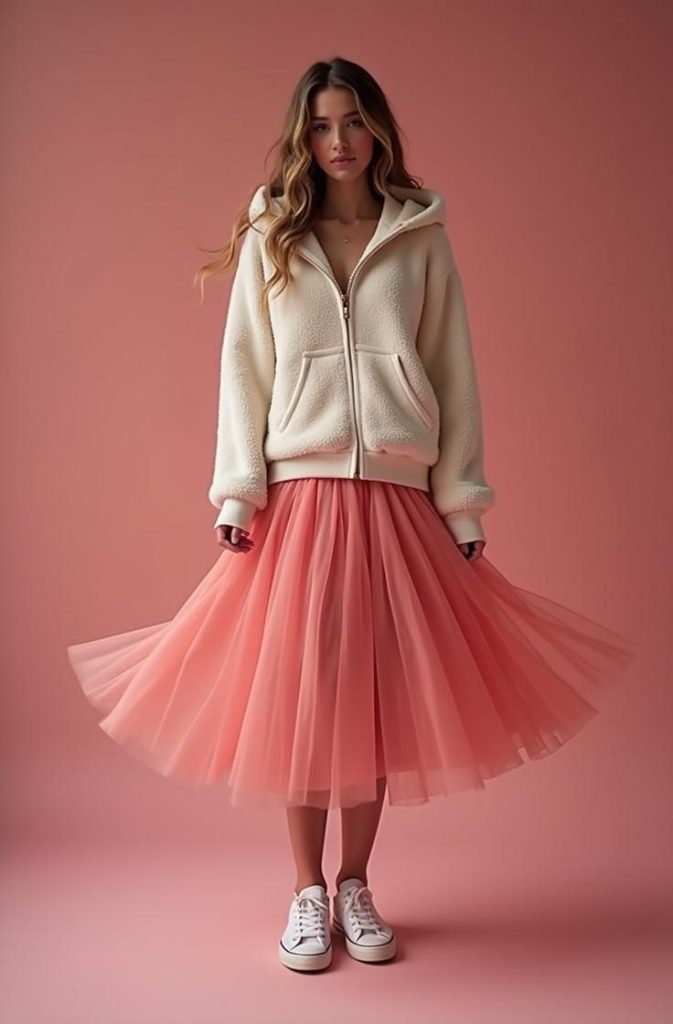 Pairing a cozy hoodie with a romantic skirt creates a modern Valentine’s Day outfit that blends comfort with feminine charm. The hoodie adds warmth and relaxation, while the skirt brings elegance and softness to the look. This contrast makes the outfit playful, trendy, and easy to wear.