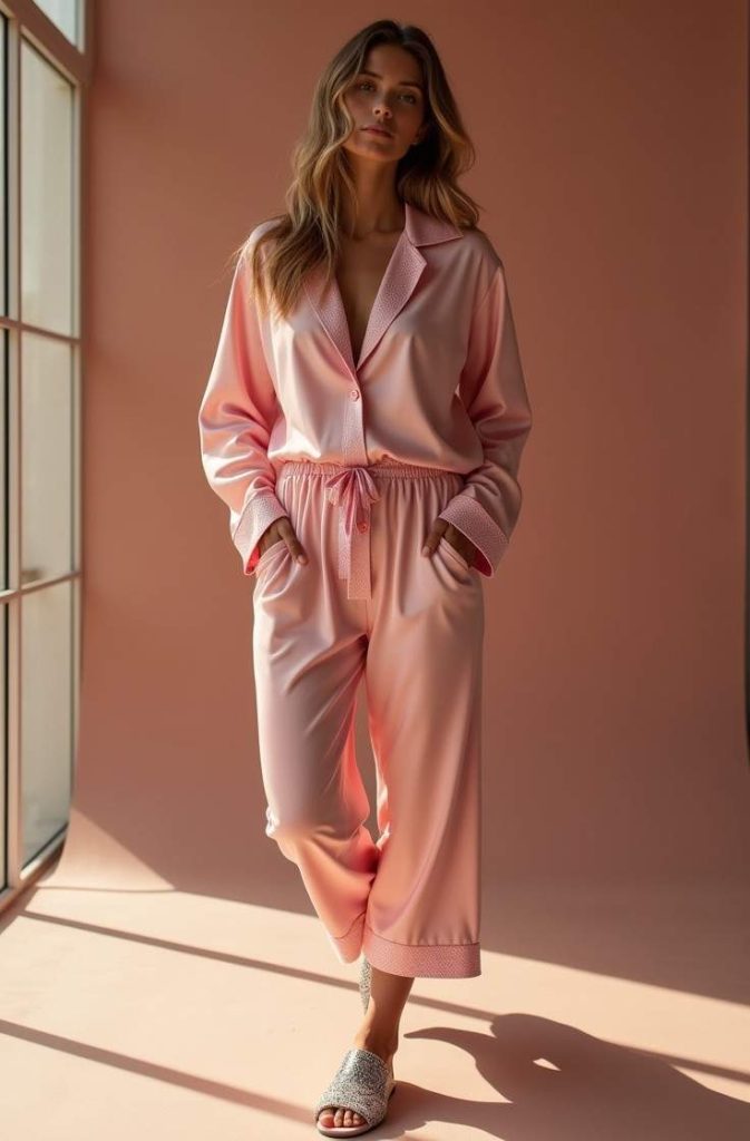A pajama-style set styled for the outdoors offers luxurious comfort with a fashionable edge for Valentine’s Day. Soft, silky fabrics feel gentle on the skin while creating an elegant, relaxed silhouette. When paired with statement accessories and polished footwear, this outfit transforms into a chic and romantic look.