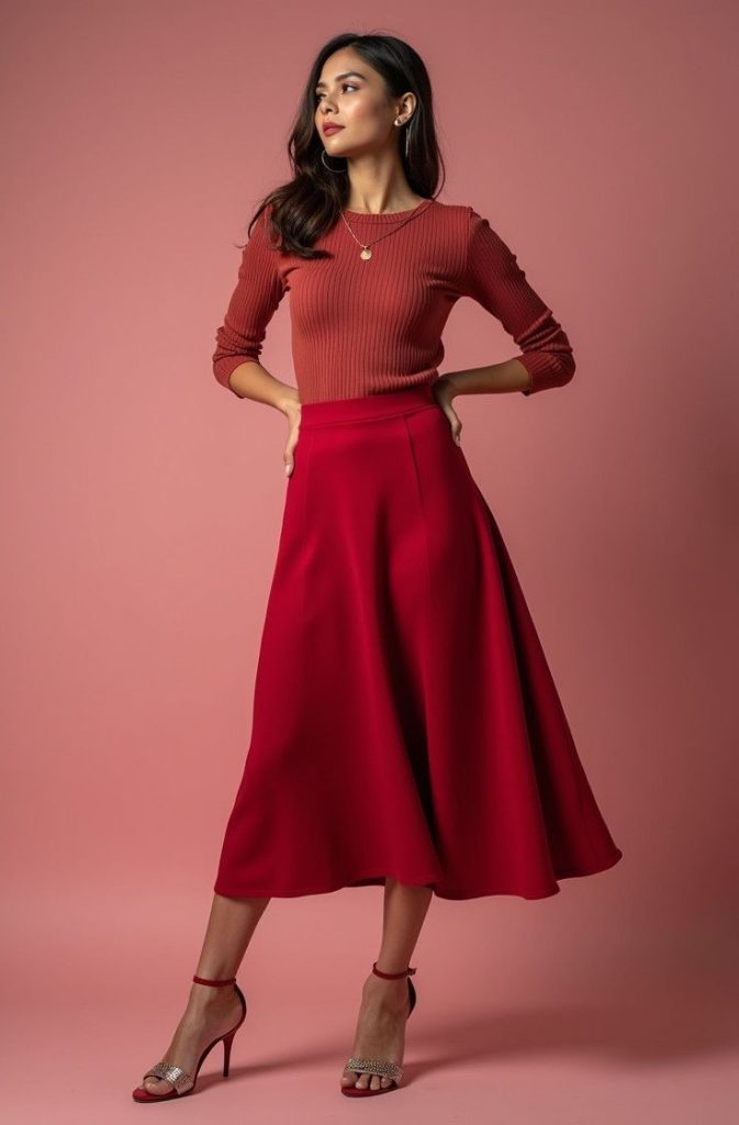 A ribbed top paired with a midi skirt creates a flattering and comfortable Valentine’s Day outfit that balances structure and softness. The ribbed fabric hugs gently without feeling tight, while the midi skirt adds flow and elegance. This combination works well for both daytime and evening plans, offering versatility and style.
