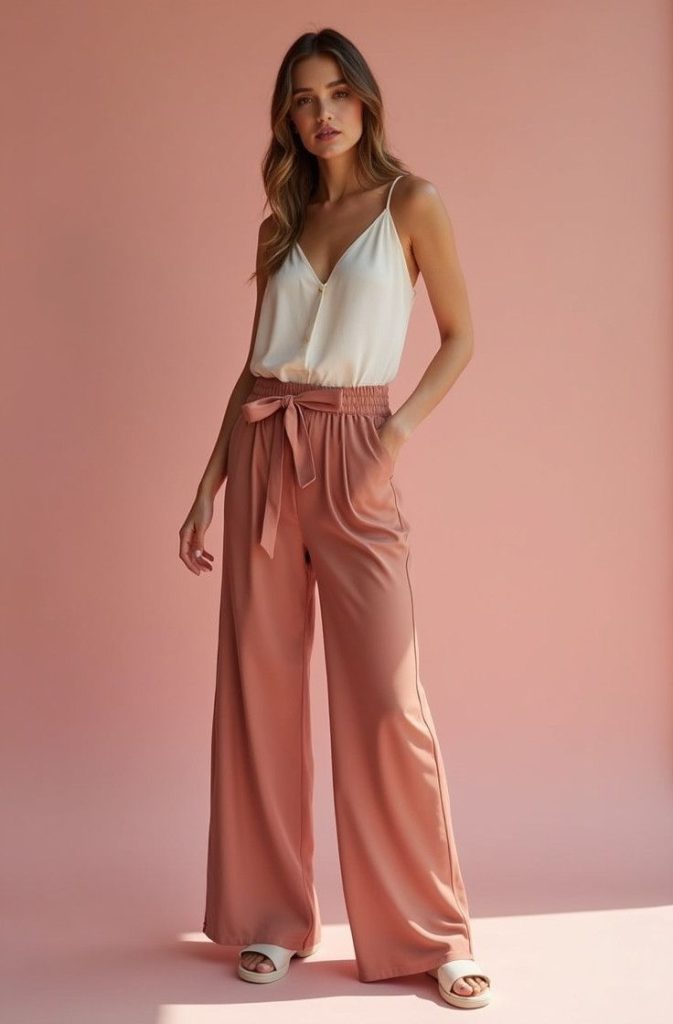 Wide-leg pants with a soft top offer a relaxed and stylish Valentine’s Day outfit that prioritizes comfort. The loose fit allows for movement and breathability, while the soft top adds a gentle, feminine touch. This combination creates a balanced silhouette that looks elegant without feeling stiff or restrictive.
