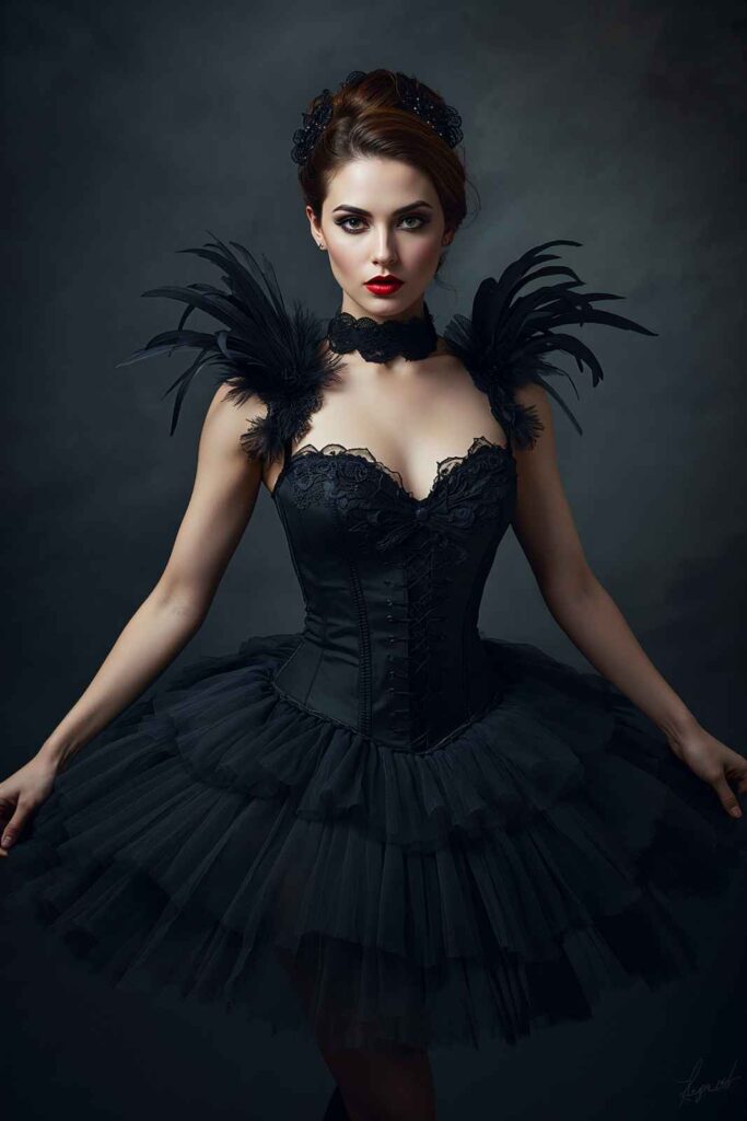 Inspired by ballet and gothic glamour, a black swan outfit uses tulle skirts, corsets, and feathers for a striking appearance.