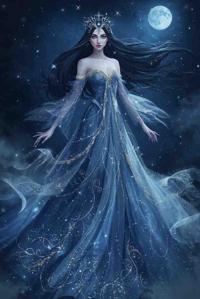 Style suggestions: Long, wavy hair with glitter accents or a twisted half-up style adds celestial charm.