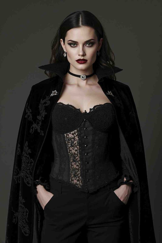 Think velvet capes, corset tops, tailored pants, or flowing gowns for a sophisticated vampire look.