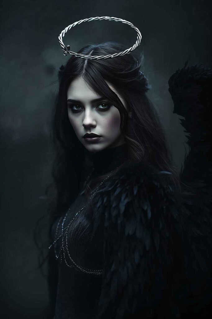 A black feathered outfit paired with a halo or wing accessory brings a moody twist to the angel aesthetic.