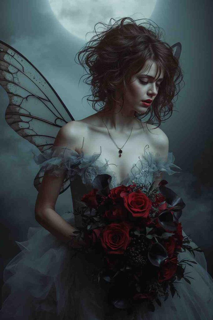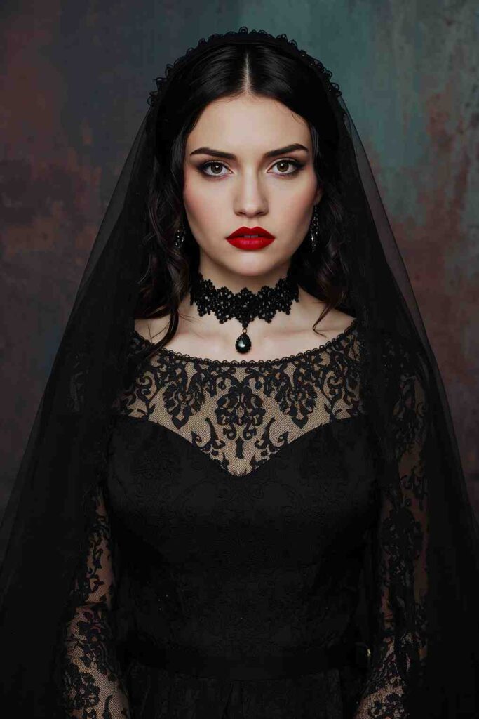 A gothic bride outfit features black lace gowns, veils, and dark accessories for a hauntingly romantic vibe.