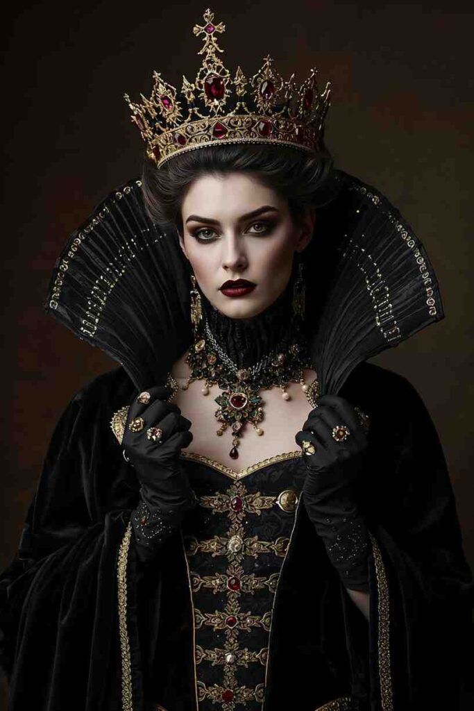 Think dramatic crowns, velvet robes, and black-and-gold outfits for a powerful, regal aesthetic.