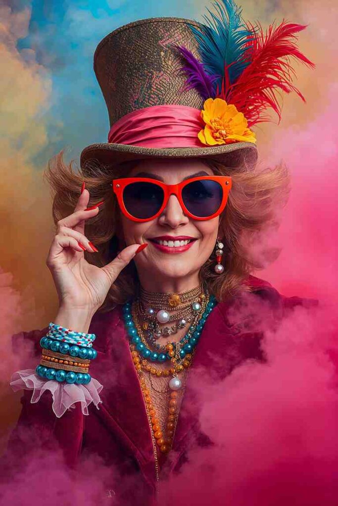 Bright colors, oversized hats, and quirky accessories make this outfit fun and eccentric.
