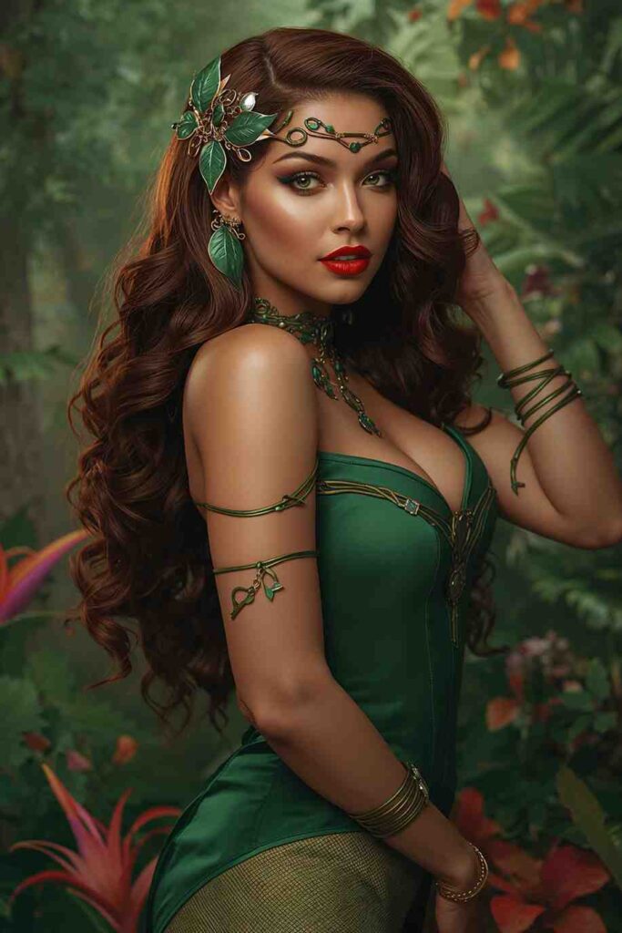 Green bodysuits, leafy accessories, and bold red lips define this iconic villain look.
