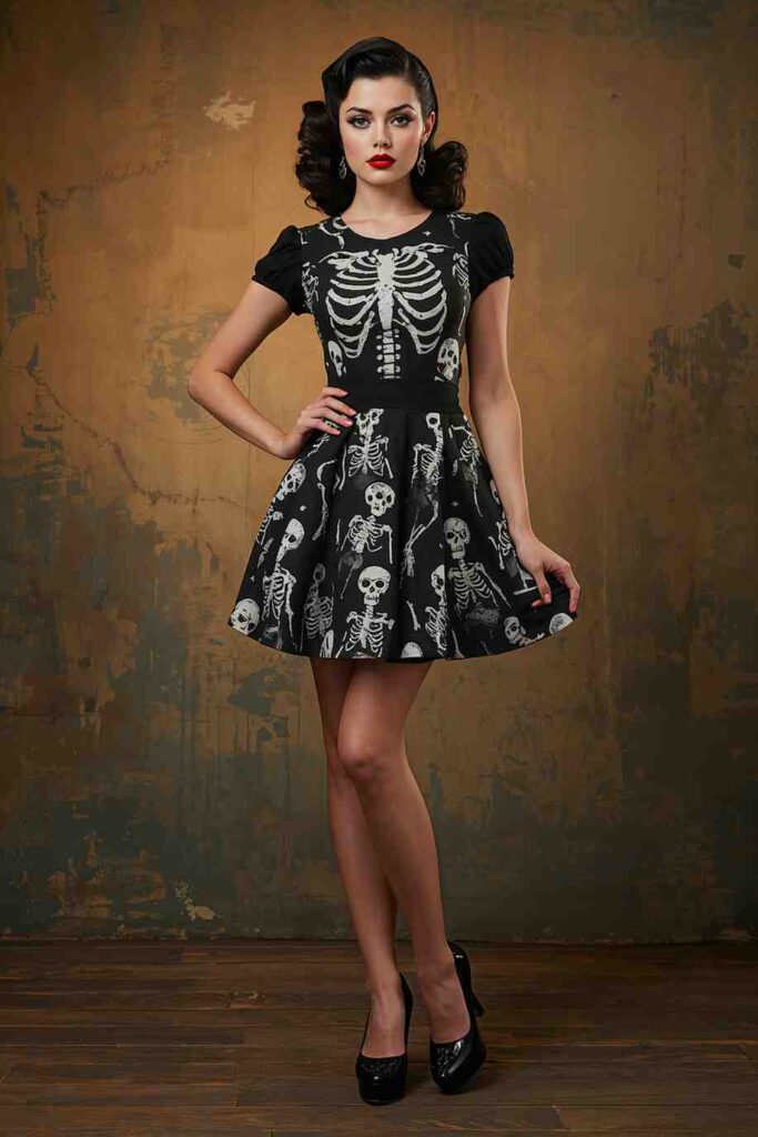 Mix retro pin-up fashion with skeleton prints for a vintage-spooky combo.