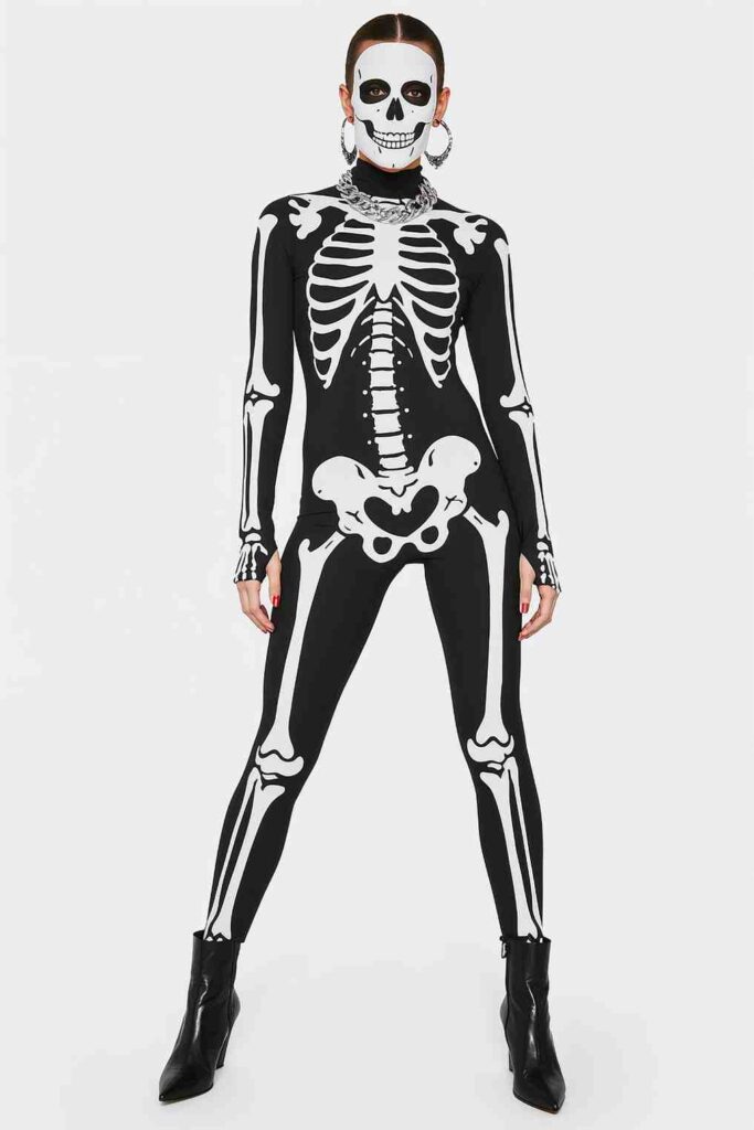 A monochrome skeleton bodysuit paired with boots and statement jewelry makes for a modern, sleek costume.
