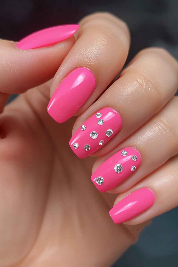 A solid bubblegum pink manicure with glossy shine or matte finish is simple but striking. Add rhinestones for a pop of sparkle.