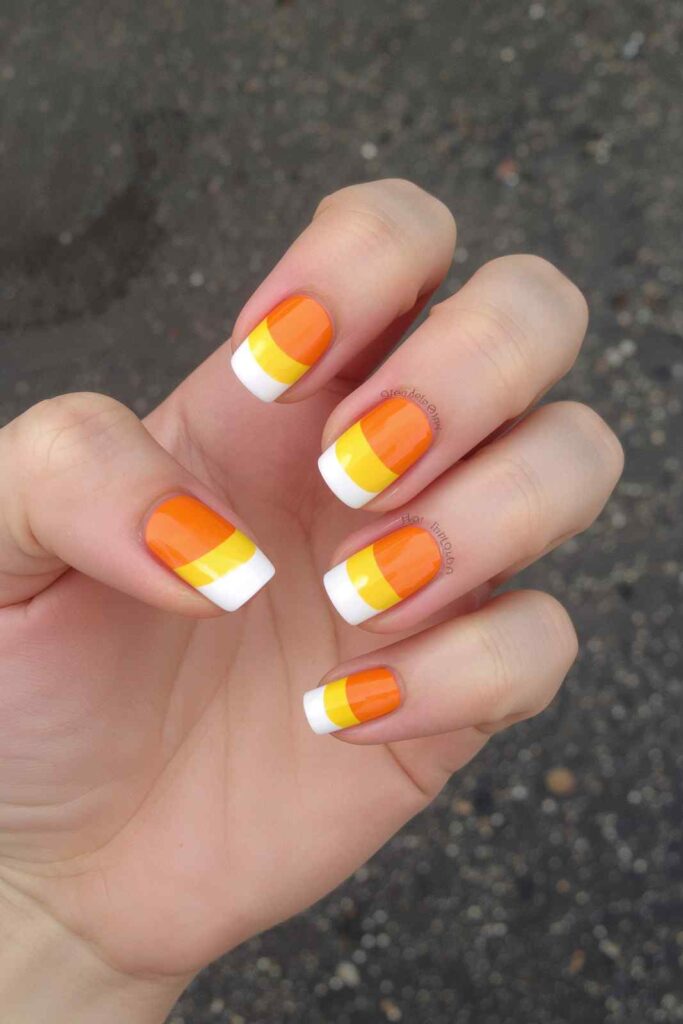 Put a sweet twist on the classic French manicure with candy corn-inspired tips. Alternate orange, yellow, and white in layered stripes for a cheerful Halloween nod.