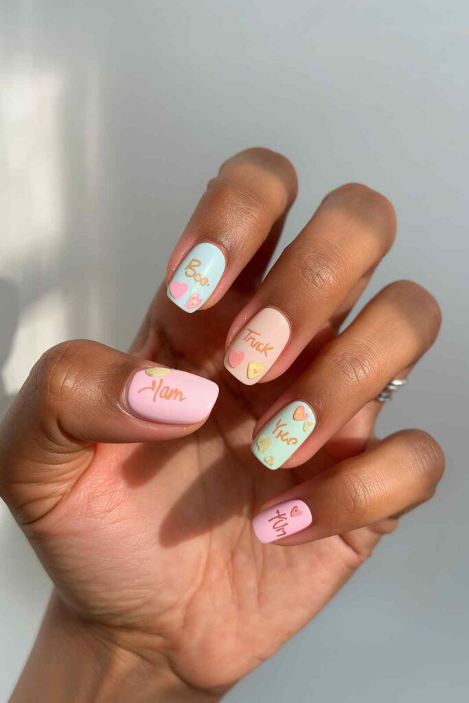 Paint pastel hearts on nails and write cute words like “Boo,” “Trick,” or “Yum” using a fine brush.