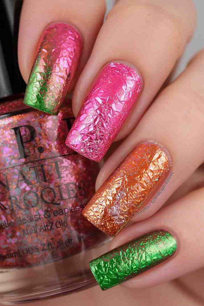 Use metallic polishes in bright pink, orange, and green to mimic candy wrappers. Add foil accents for texture.