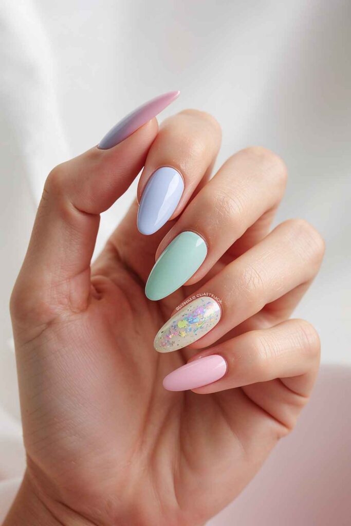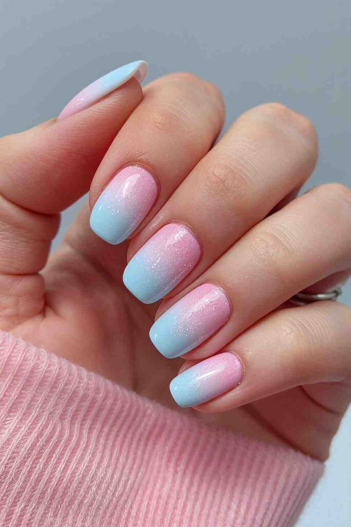 Blend pink and blue in a soft ombre for a dreamy cotton candy effect. Add a shimmery top coat for an extra magical touch.