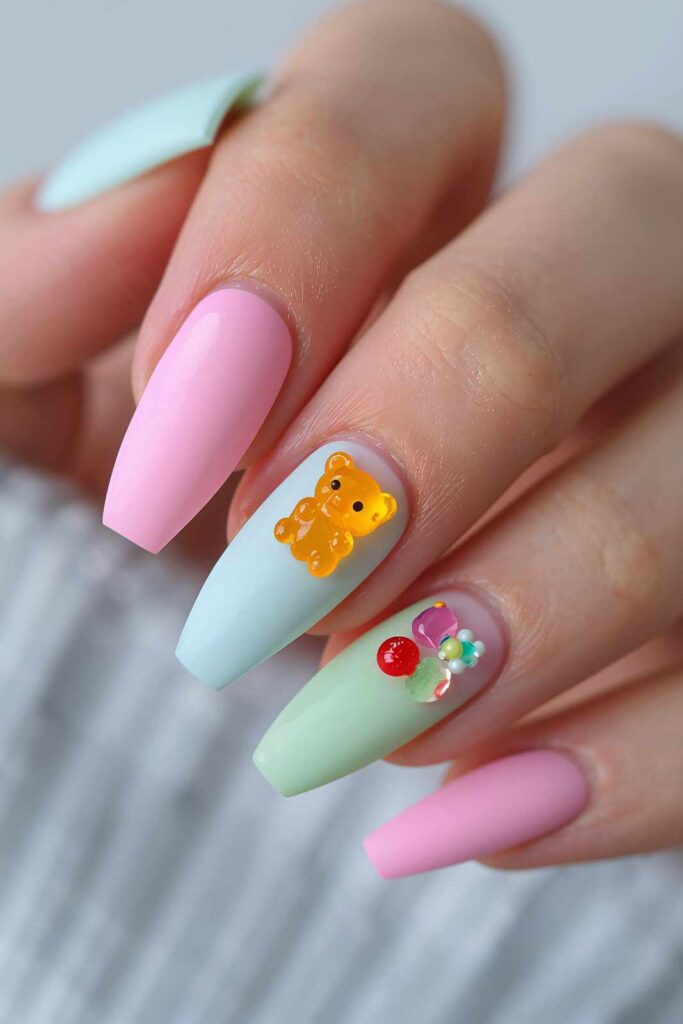 Tiny 3D gummy bear charms or decals on pastel-colored nails give a whimsical, youthful feel.