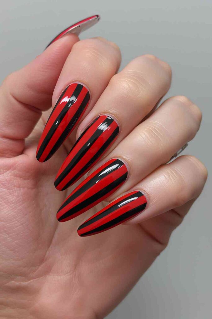 Alternate black and red stripes for a bold, slightly edgy candy-inspired manicure.