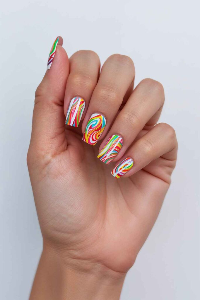 Paint white stripes on one or two nails to mimic lollipop sticks while keeping the others bright and swirly.