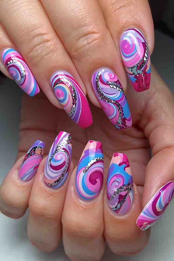 Bright, swirling designs in pinks, purples, and blues mimic the classic lollipop. Add a glossy top coat for a candy-like shine.