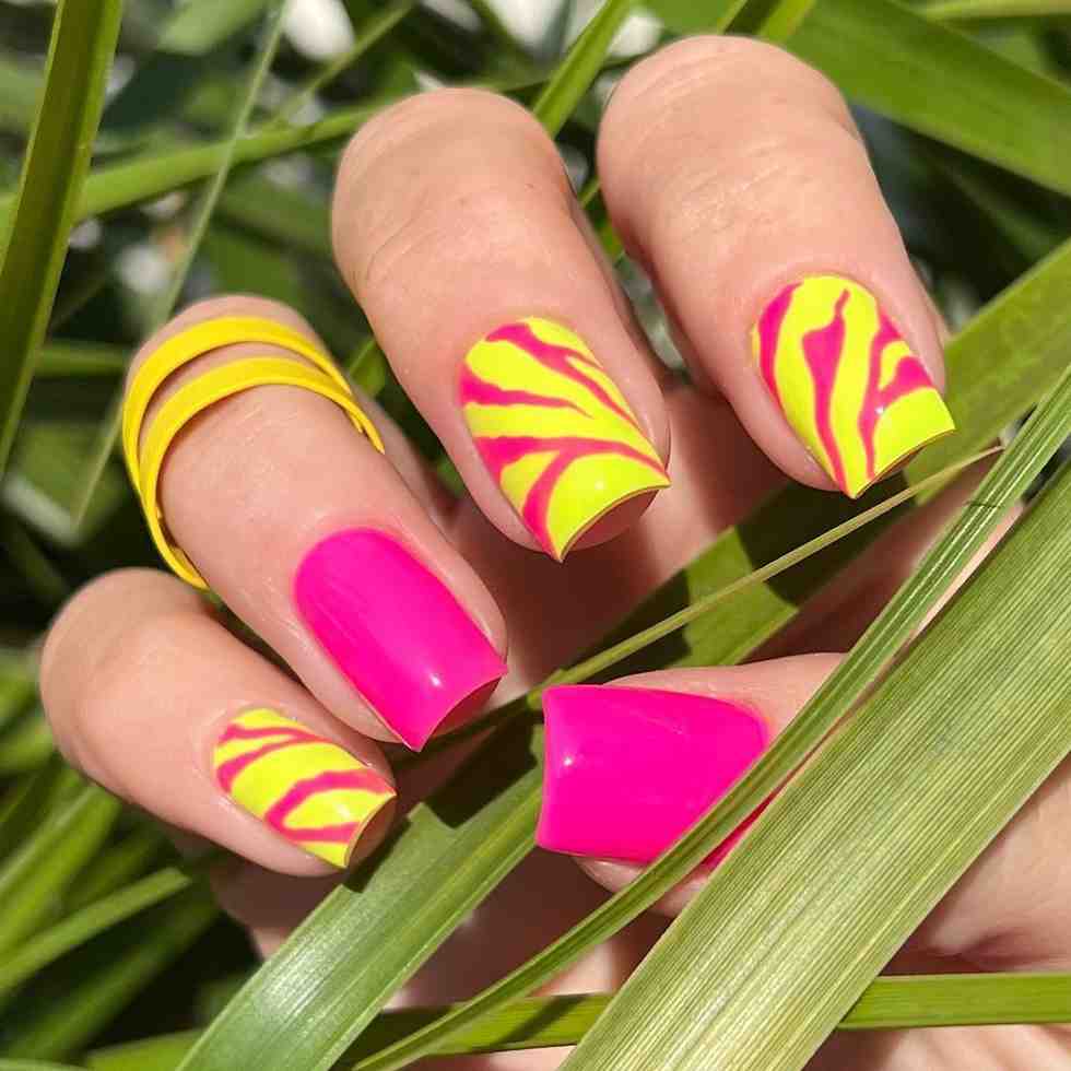 Paint thin neon stripes across a white or nude base to create a retro candy shop vibe.