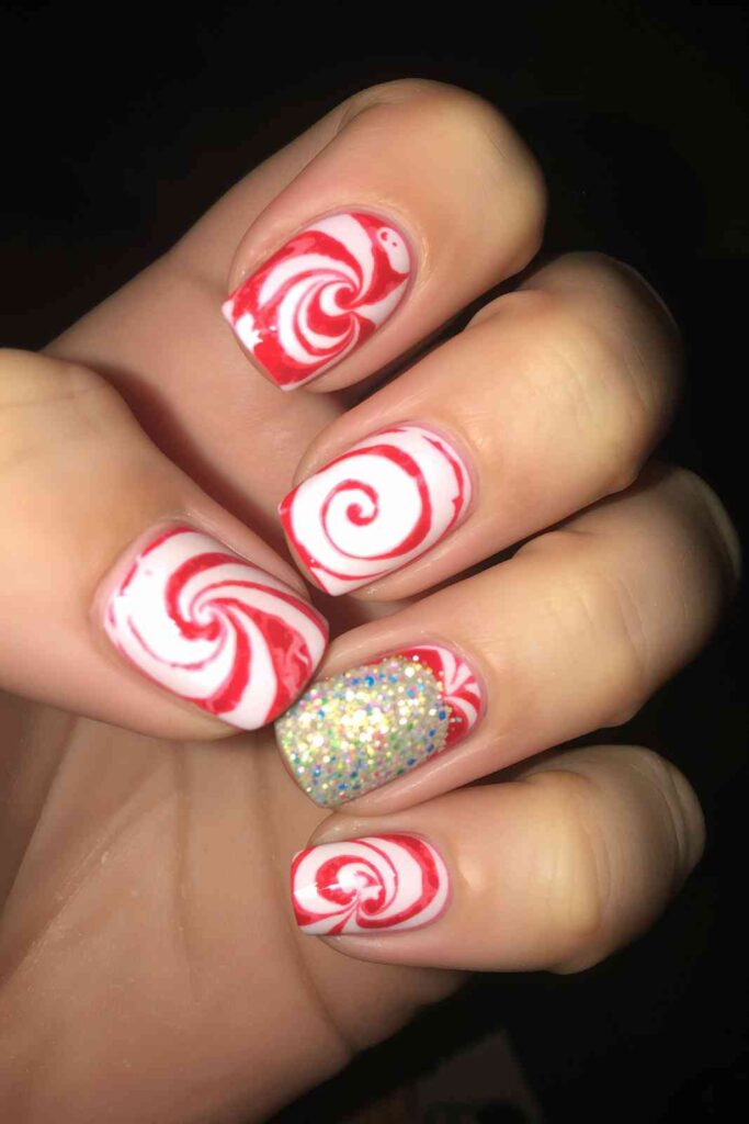 Red-and-white swirl nails are reminiscent of candy canes but work just as well for Halloween. Add a single accent nail with glitter for sparkle.